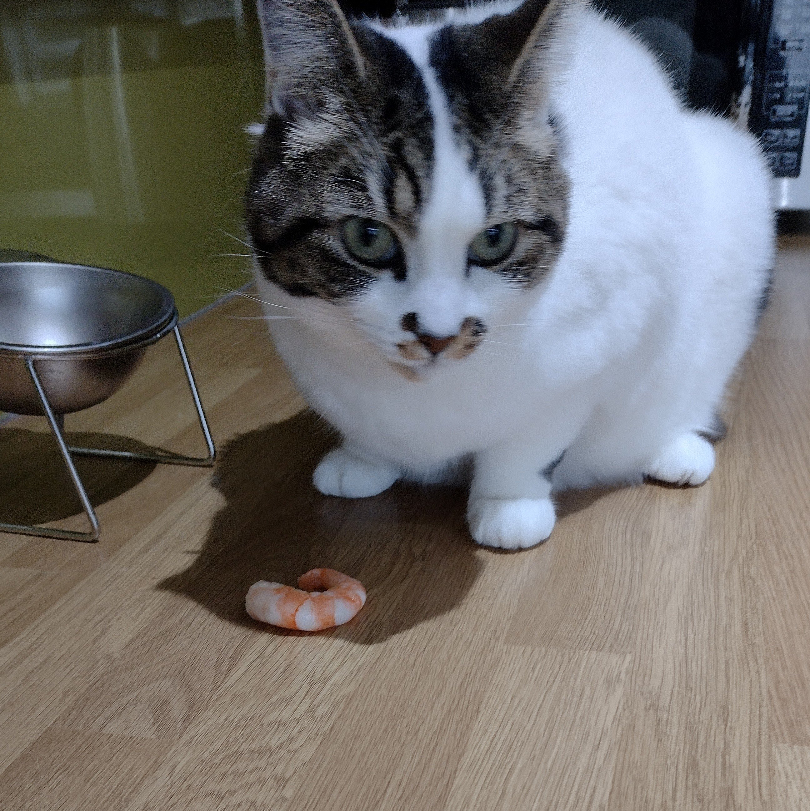 Shadow has just finished her prawns @Biblioklept - & wishes you all a Merry Christmas. She takes them out of her food bowl to tackle them: