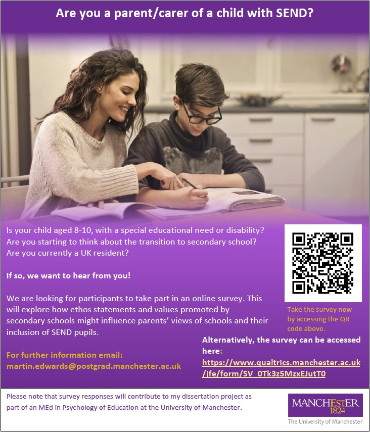 I am a Masters’ student at the University of Manchester studying for the Psychology of Education MEd. As part of my dissertation, I am researching how parents view information about the ethos and culture statements promoted by secondary schools and how it may affect perceptions of SEND inclusion within them. I would be very grateful if you would complete the suvey below and share it with anyone you know who may meet the criteria above.