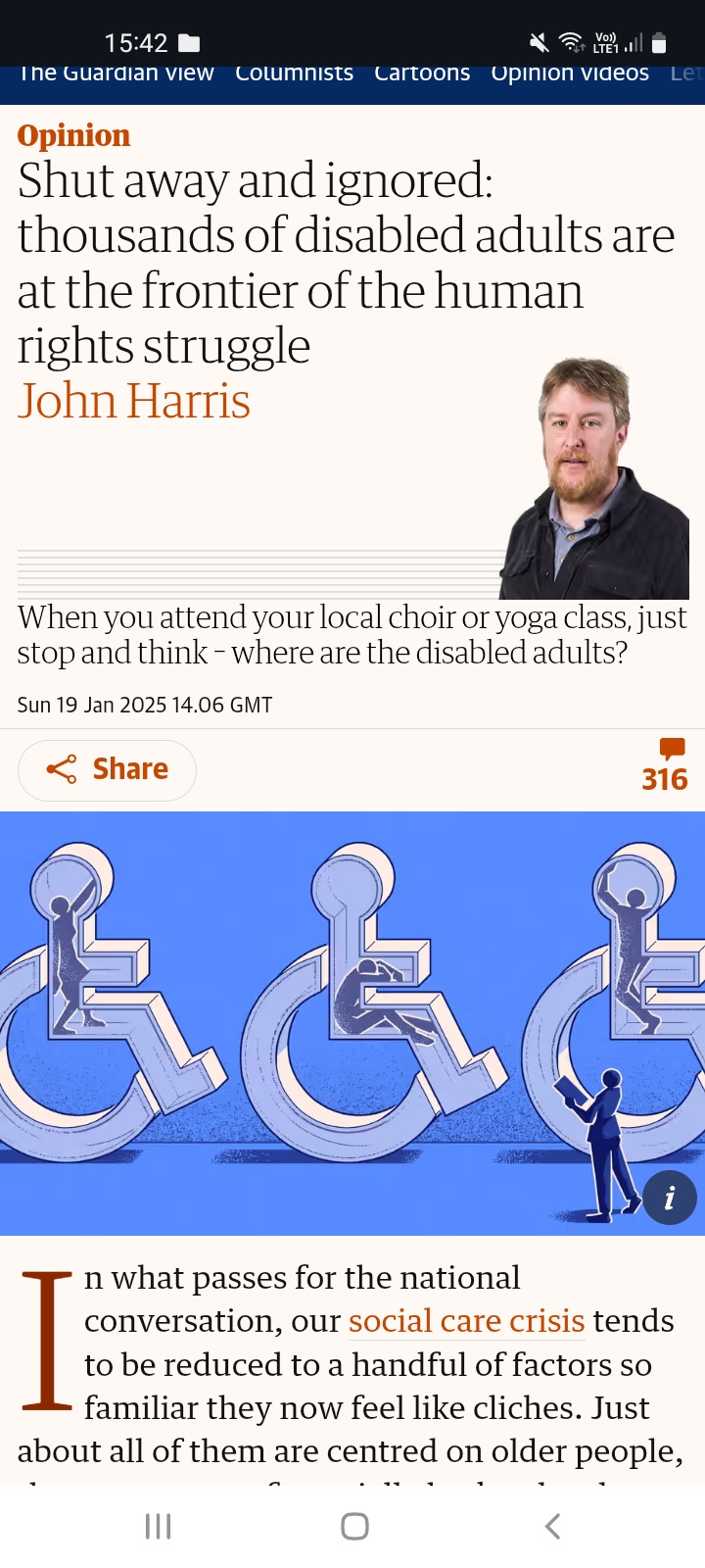 Image description: Screenshot of an article on the Guardian titled "Shut away and ignored: thousands of disabled adults are at the frontier of the human rights struggle". The accompanying image of a cartoon, showing three transparent wheelchair symbols. You can see a silhouette of a distressed person trapped inside each one, two standing and one seated. A standing figure stands infront of them holding a clipboard"