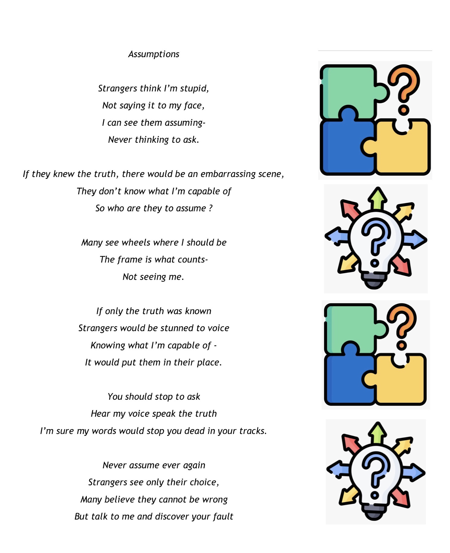 Those words really strike home to me. So many people have made assumptions about me without knowing me, my life experiences or my hidden capabilities at all, which I found so frustrating and hurtful. Not just me, but my much loved granddaughter when she does or says something other people don’t understand and they judge her. She’s autistic and so many ignorant people have hurt her so much. She’s 14 now and is really struggling sometimes. I’ll show her this. Thank you.