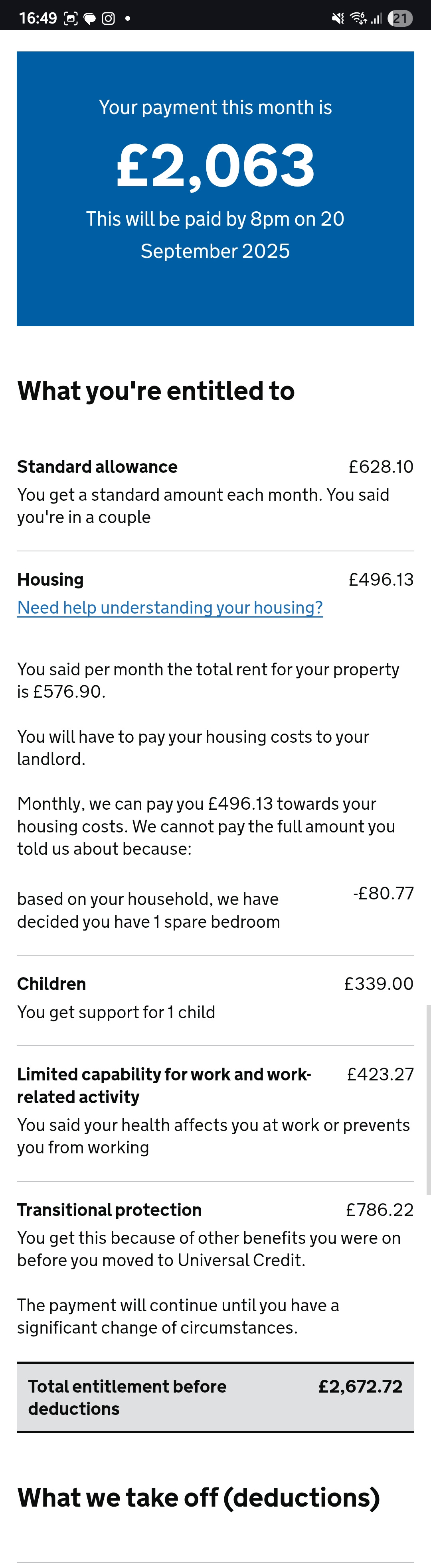 If awarded your Transitional Protection will reduce by £201.68 which is the Carers Element amount.