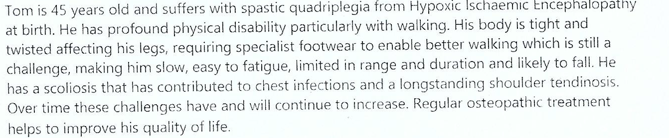 'I have known Tom for several years and am aware that he has CP. I have seen that he wears bespoke specialist footwear, that enables him to walk, at least to a degree. I have accompained him on short walks over the last year or two, and have noticed a nioticeable deteriorarion in his mobility. He is so much more unsteady on his feet now, takes several attempts to rise from a seated position, and is very wobbly. I have witnessed him falling down on many occassions, and noticed that the slightest undulation causes him major problems. I feel that this has impacted upon his confidence as a result of which he ventures out for fresh air far less than he used to. This has contributed to his already poor immune system, his face taking on an unhealthy pallor, and I can recall him suffering from many bugs over the past year or two, including a bout of pneumonia, which led him to be hospitalised.