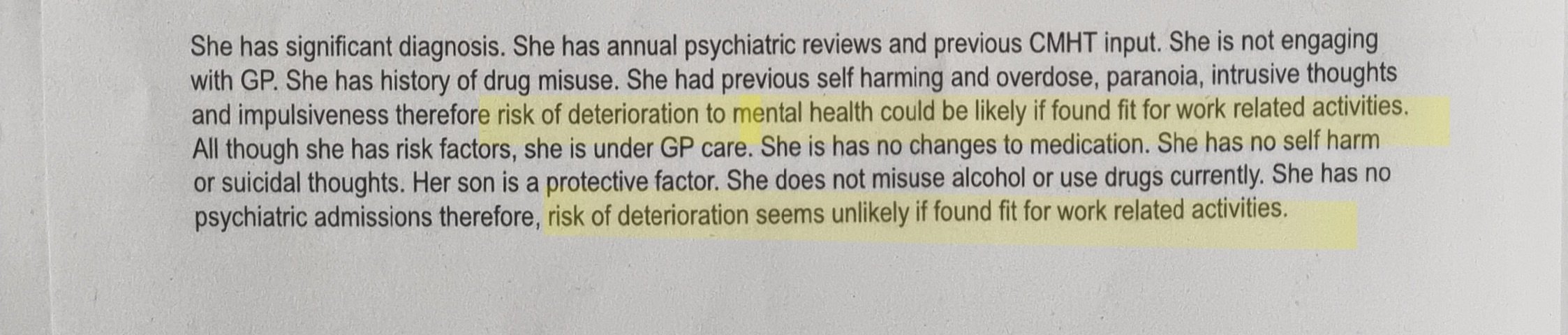 Just finding out the outcome that I am considered fit for WRA has caused a real tangible deterioration. I am not able to sleep or eat. Being found fit for activities means I am pushed into a future where I have no end in sight of poverty and debt. I don't have enough money to pay for my basic bills. I am absolutely suicidal due to that.