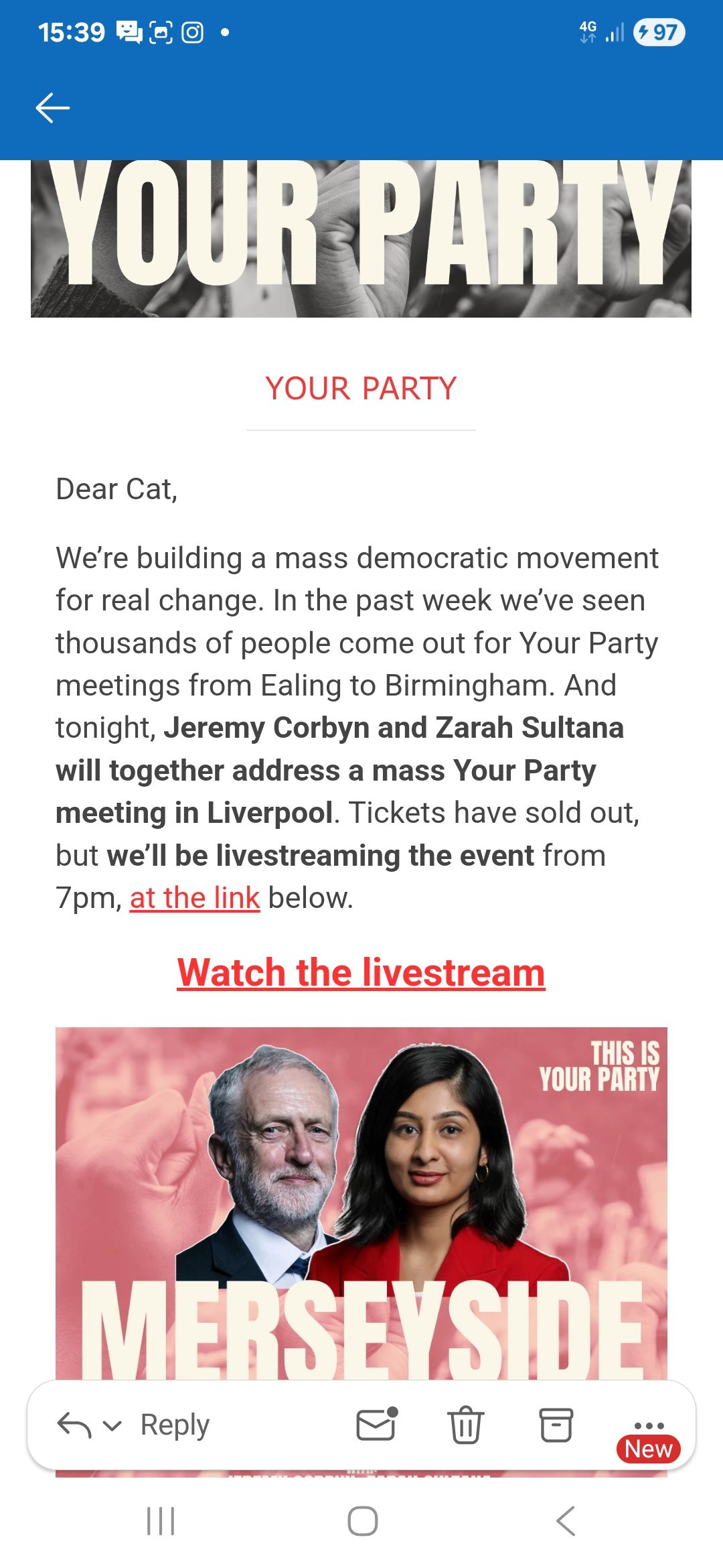 Screenshot shows a newsletter image. Text reads: Your Party. Dear Cat, We're building a mass democratic movement for real change. In the past week we've seen thousands of people come out for Your Party meetings from Ealing to Birmingham. And tonight, Jeremy Corbyn and Zarah Sultana will together address a mass Your Party meeting in Liverpool. Tickets have sold out, but we'll be livestreaming the event from 7pm. [Link has not been provided]