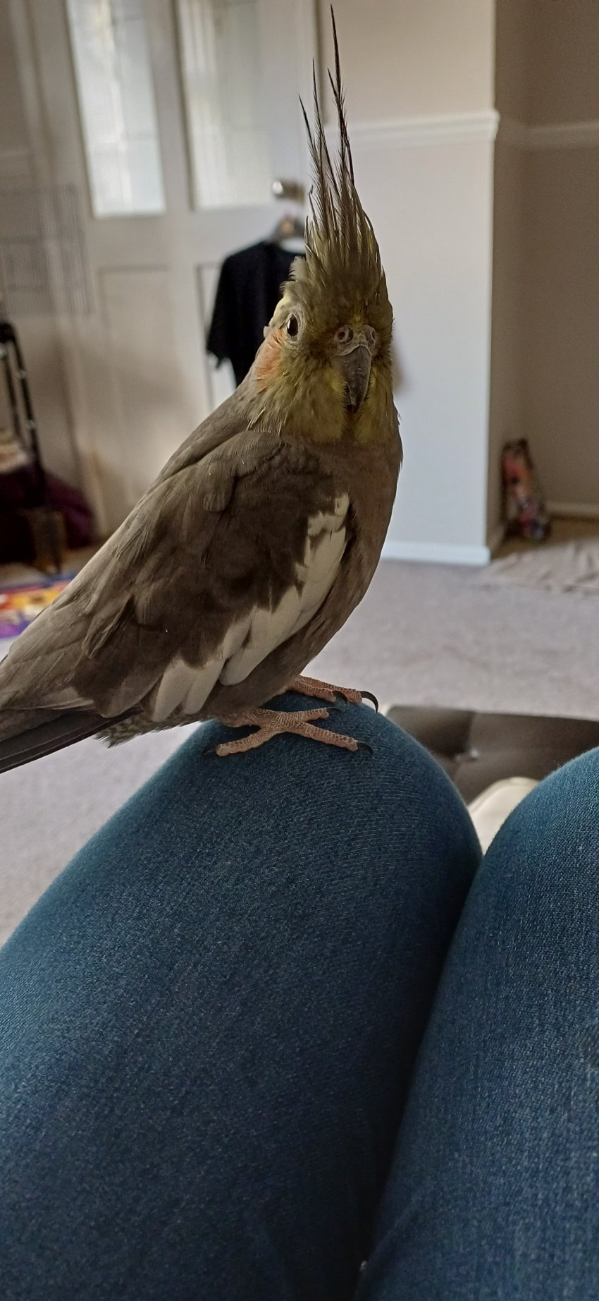 Maybe this will help? Angel perched on my arm as I watch a movie....
