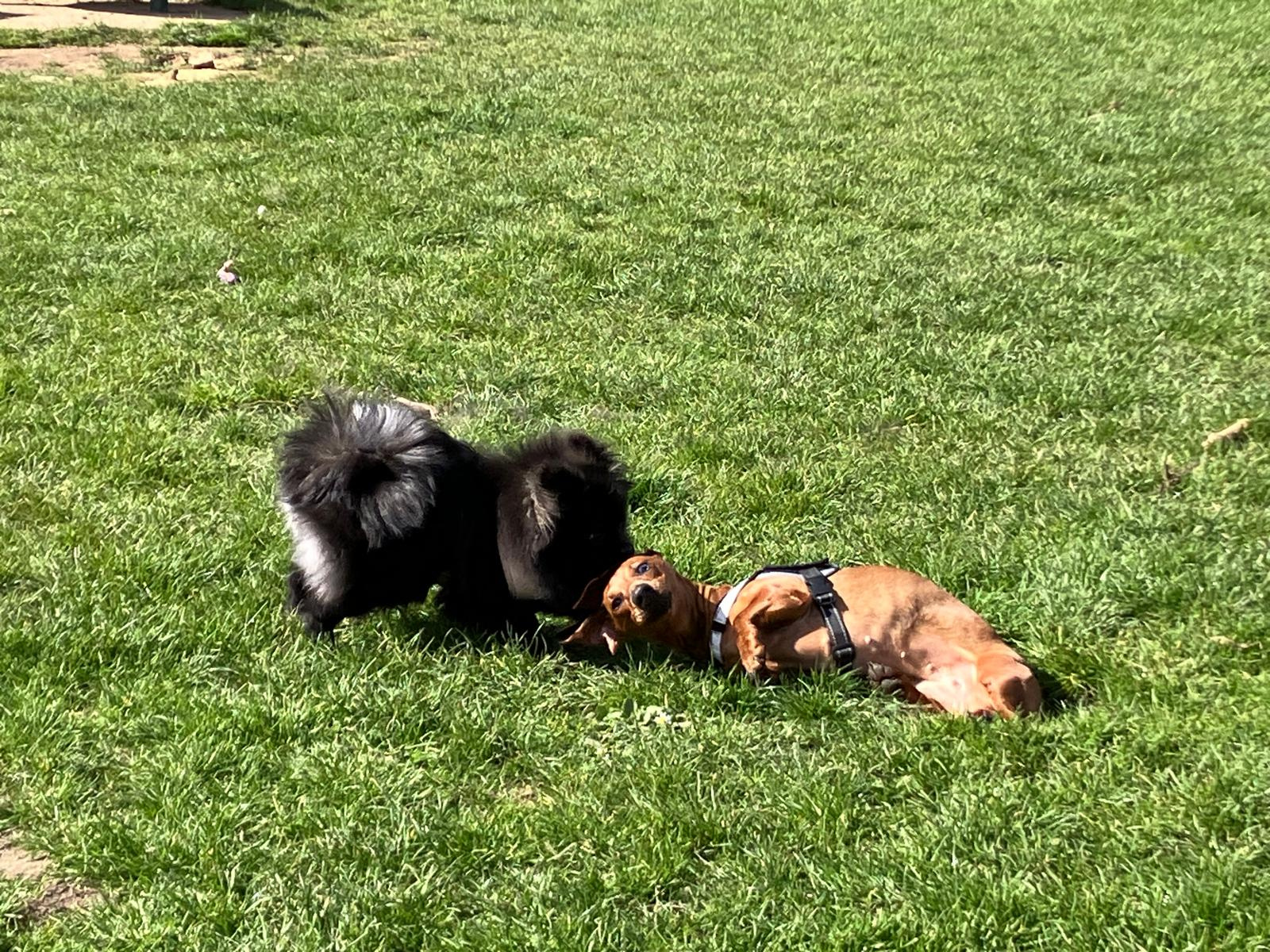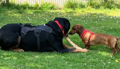 The little dog is mine, @Josephine23, Rambo belongs to someone else that we often see when we go to the dog park. He is a real softy, a lovely dog. Loves Hattie & lets her do what she likes, she's a cheeky little dachs.