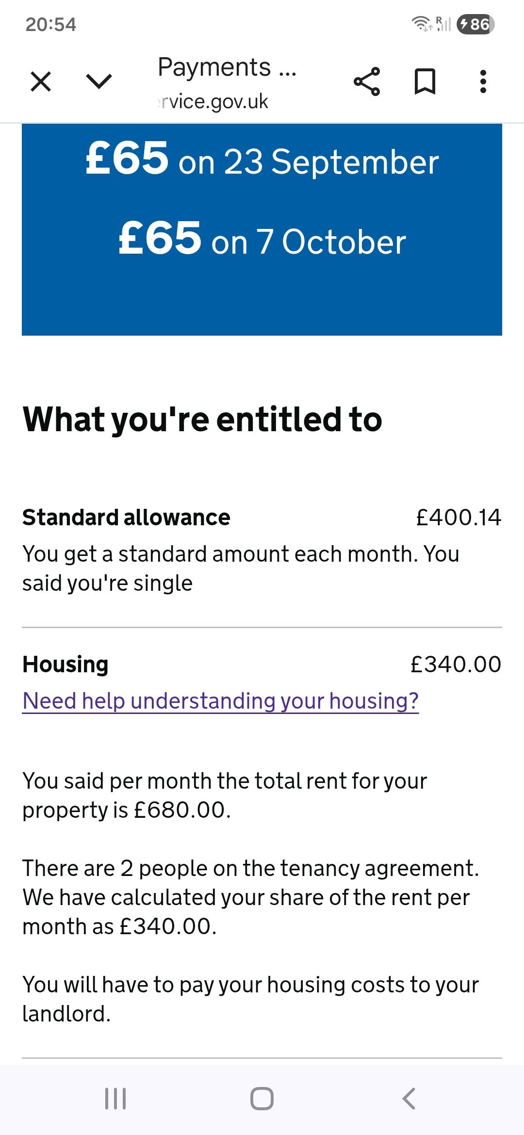 I live in n Ireland and recently been moved to uc. Before the move i was on esa and received £323.50 a fortnight and housing benefit of £156.58 a fortnight. Im now receiving £281.10 esa a fortnight and £65.55 uc a fortnight. Which is now a total of £633.40 a month, which has dropped from £960.16 per month. Also I need to pay rent of £340 per month which leaves me with less than £300 to live on. Why I'm i not getting help with housing?