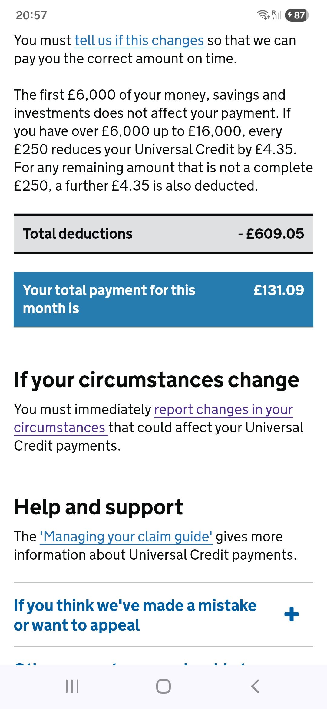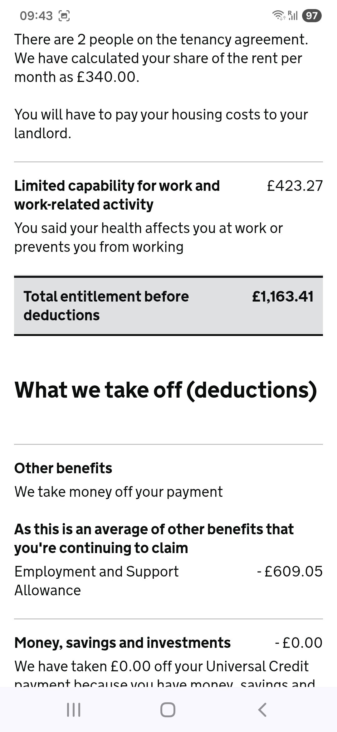 LCWRA element is missing from your statement. This increases your UC award before deductions by £423.27.