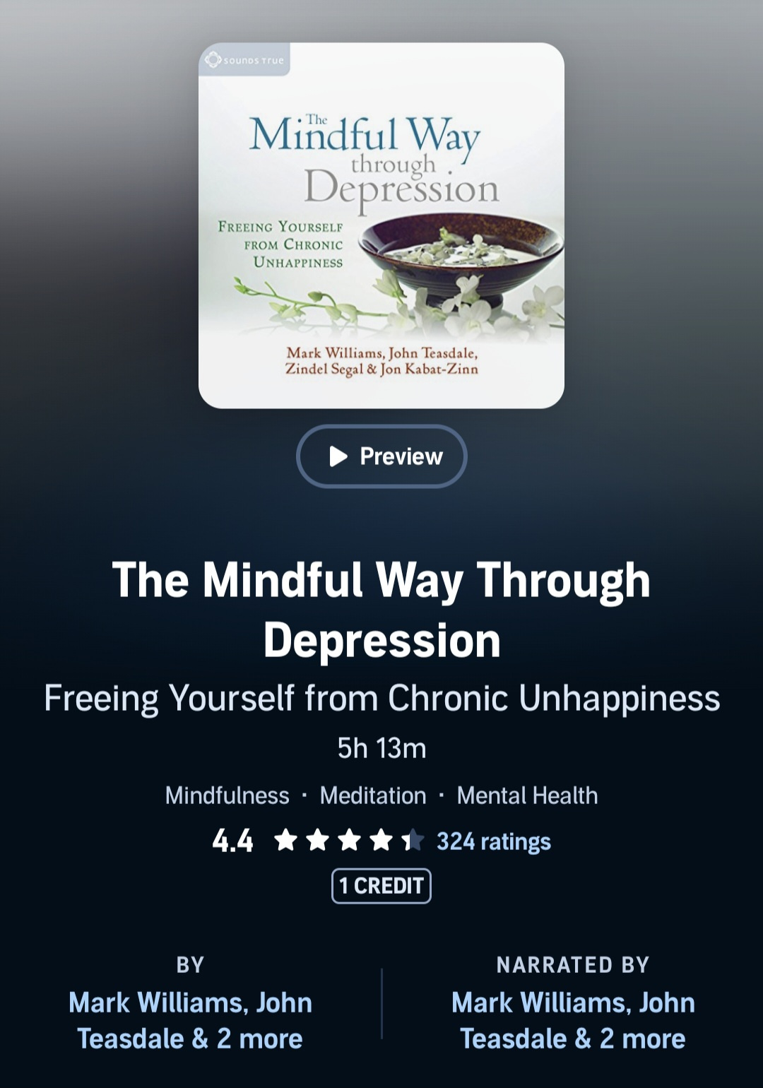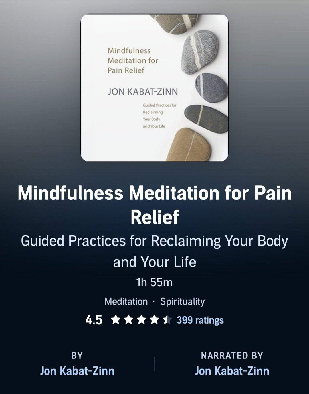 MINDFULNESS MEDITATION FOR PAIN: A couple of years ago, when my immobility took a firm hold, I undertook a program by Jon Kabat-Zinn of mindfulness meditations used to treat pain. We now live in a time of audiobooks, so that audiobook is what got me started on audiobooks.