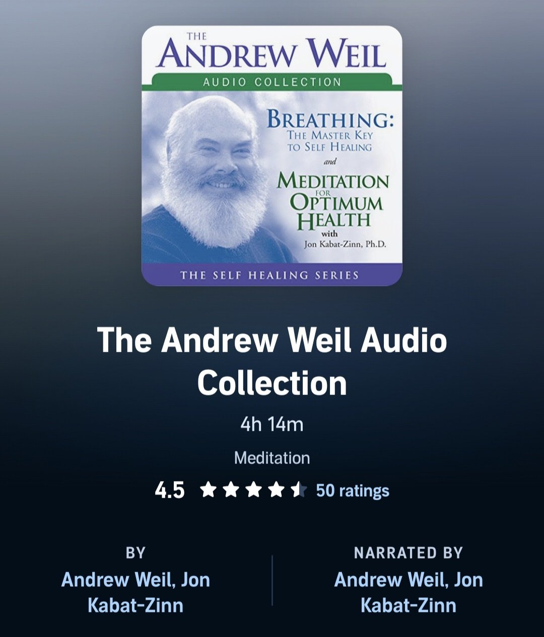 BREATH MEDITATIONS: I didn't know until I started the pain audiobook that there are meditations on the breath. I mean, I had heard them here and there, but they never really stuck. And breath is a part of all the meditations I have done, but not the focus of the meditation. So I bought an old audiobook by an author who I am familiar with through the CBT-mindfulness book, namely Dr. Andrew Weil. His book has a load of different breath meditations, which really help manage my pain. There are only a couple of the breath meditations that I don't like.