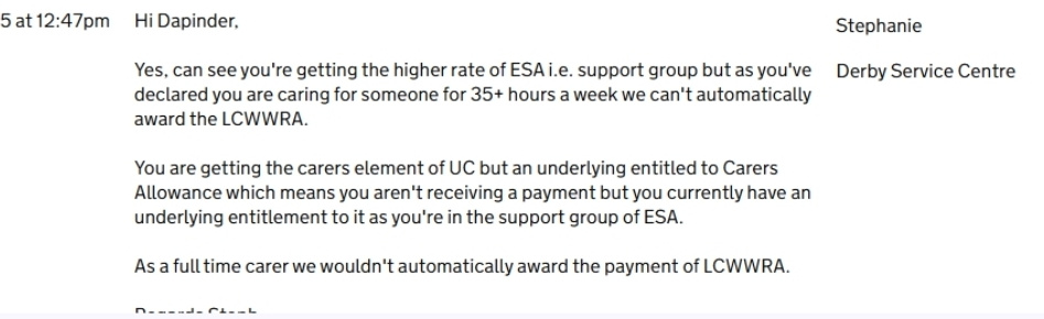 "If you were in ESA Support Group at the time of claiming UC, you should have been given the equivalent under UC automatically which is LCWRA."