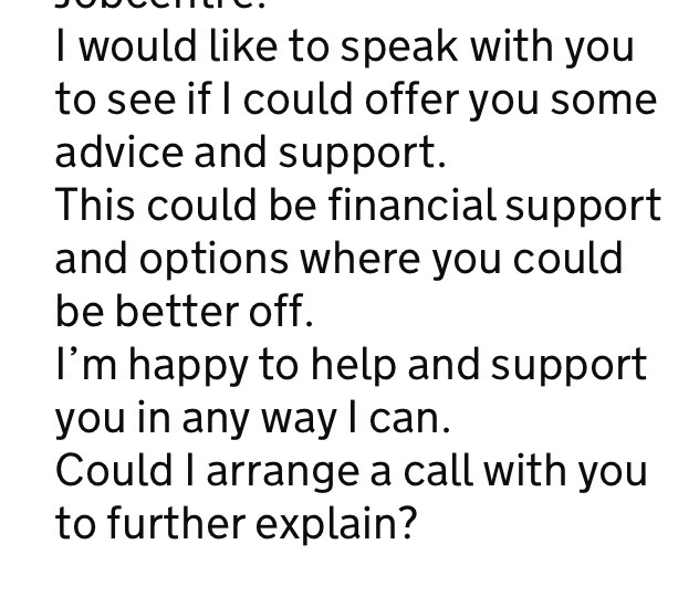 This morning I had a text message to say I had a message on my journal that I needed to read, it’s from someone from my local job centre (I get lcwra) this isn’t a message I’ve had before and others say its voluntary to help if I wanted to try and get back to work so I am unsure if I have to arrange to have a call with them? I’ve attached the message below (with all details of names and job centre removed) if anyone could kindly help me with if I have to do this or can just be ignored like the voluntary batch messages they have sent me offering support if wanted