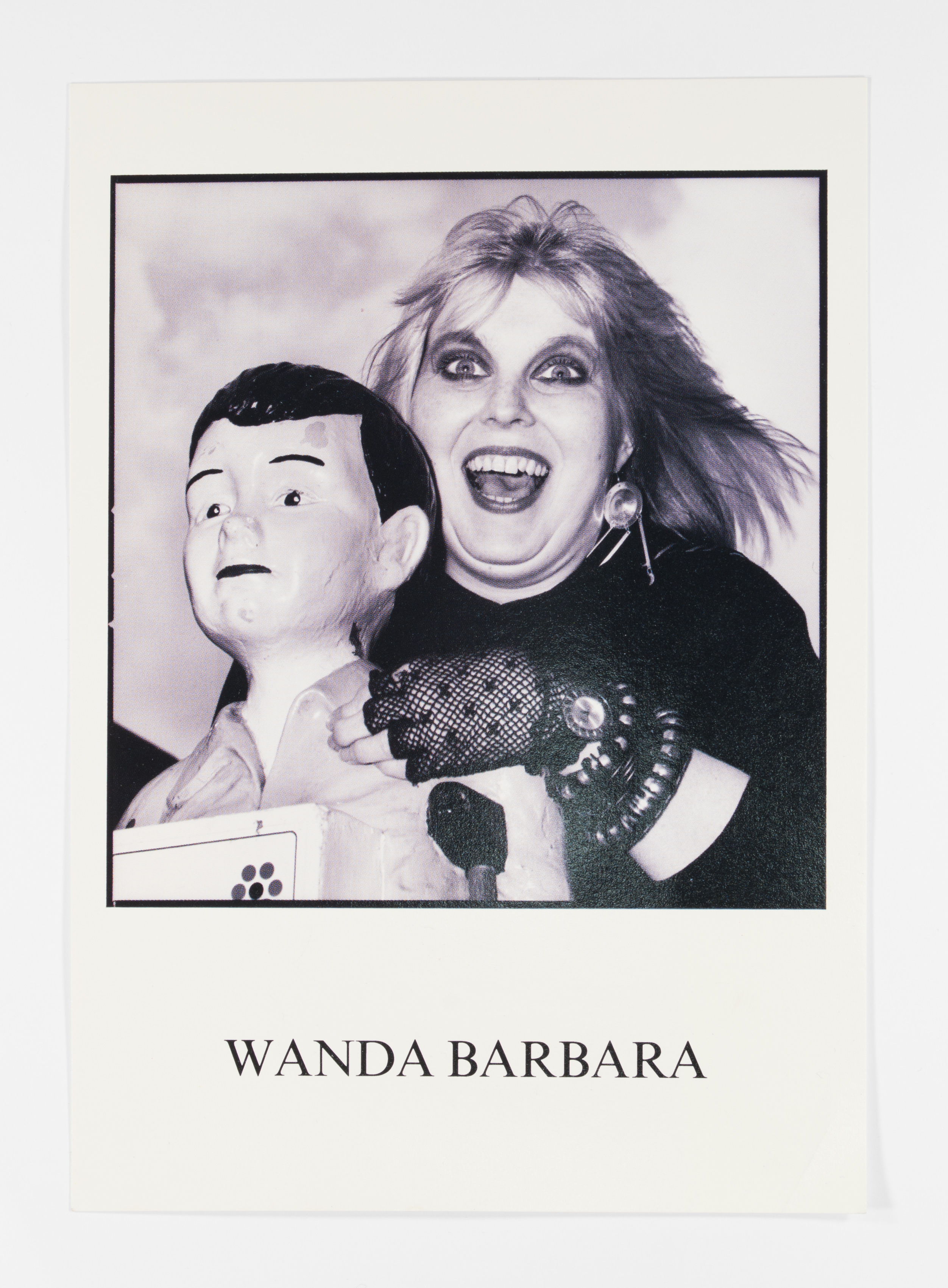 Barbara Lisicki in the 1980s as 'Wanda Barbara', with a ventriloquists dummy. She has wild hair and dark eye makeup and is smiling widely at the camera