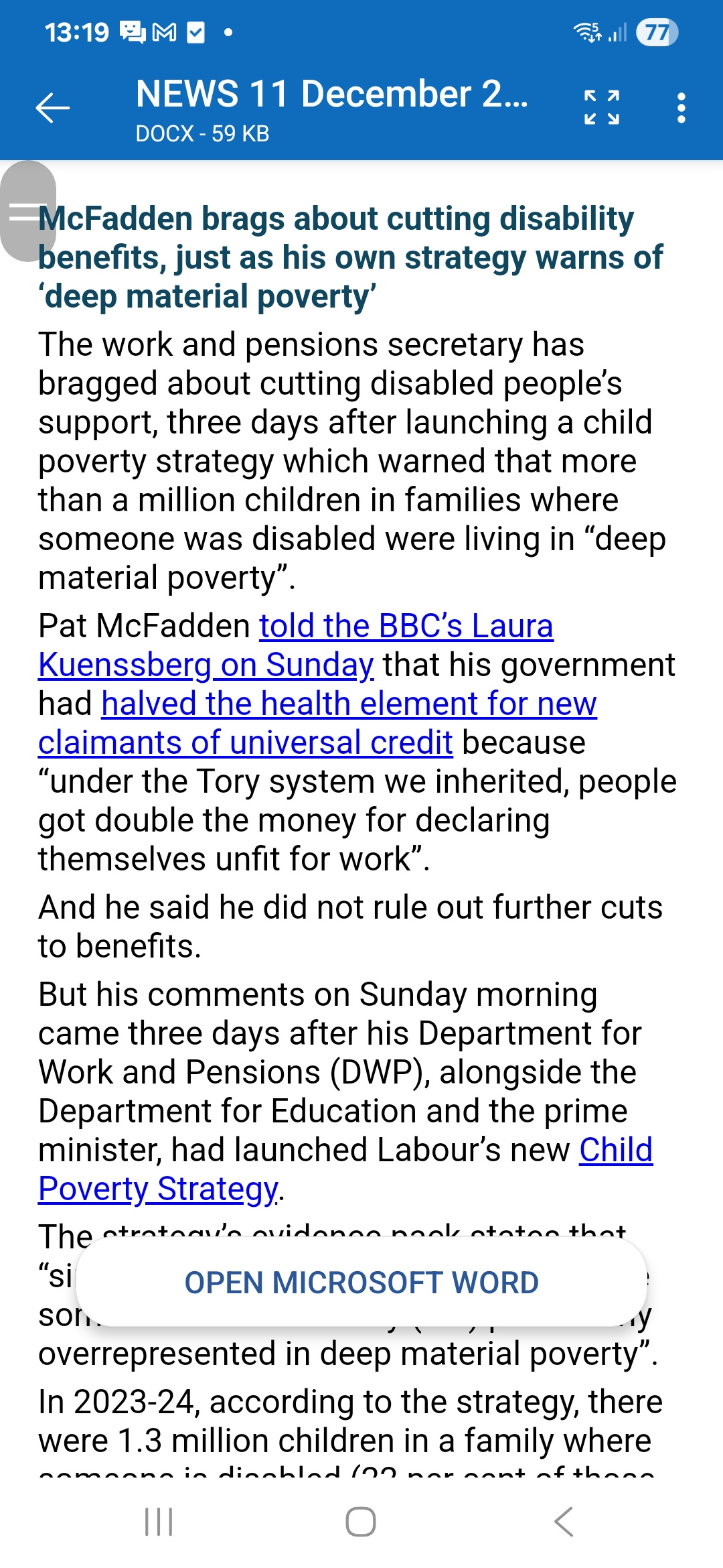 ![McFadden brags about cutting disability benefits, just as his own strategy warns of 'deep material poverty' The work and pensions secretary has bragged about cutting disabled people's support, three days after launching a child poverty strategy which warned that more than a million children in families where someone was disabled were living in "deep material poverty". Pat McFadden told the BBC's Laura Kuenssberg on Sunday that his government had halved the health element for new claimants of universal credit because "under the Tory system we inherited, people got double the money for declaring themselves unfit for work". And he said he did not rule out further cuts to benefits. But his comments on Sunday morning came three days after his Department for Work and Pensions (DWP), alongside the Department for Education and the prime minister, had launched Labour's new Child Poverty Strategy. The strategy's evidence pack states that "single parent families and families where someone has a disability (are) particularly overrepresented in deep material poverty". In 2023-24, according to the strategy, there were 1.3 million children in a family where someone is disabled (22 per cent of those children) who were in "deep material poverty". The evidence pack points to disabled people's "high additional living expenses such as transport, home adaptations, or specialist equipment", while "caring responsibilities or accessibility issues can mean that it is difficult or not possible to find work that suits [those families'] requirements". The report itself says that "deep material poverty is especially pronounced for children in single parent families and children in families with disability". And it adds: "There are parents who may not be able to work, for example due to severe disability, or who fall on difficult times. " "It is not right that we have a system where children are penalised through no fault of their own." Three days later, McFadden boasted to Kuenssberg about doing exactly that by slashing the health element of universal credit for most new claimants by about £50 a week from next April. Announcing the Child Poverty Strategy, the government said it would lift about 550,000 children out of poverty by 2030 and tackle the "root causes of poverty by cutting the cost of essentials, boosting family incomes, and improving local services". Measures include making it easier for new parents who receive universal credit to return to work by extending eligibility for upfront childcare costs to those returning from parental leave; ending the unlawful placement of families in bed and breakfasts beyond the six-week limit; introducing a new legal duty for councils to notify schools, health visitors, and GPs when a child is placed in temporary accommodation; and taking measures to help families buy more The government had already announced at last month's budget that it was removing the universal credit two-child limit that was imposed by the last government in 2017. Asked by Disability News Service (DNS) to respond to McFadden's comments, and to say whether he would apologise for his misleading statement about claimants "declaring themselves unfit for work" - when there is a lengthy and harsh "fitness for work" assessment process - a government spokesperson said: "We are reforming the broken system we inherited by tackling perverse incentives around sickness claims, increasing face-to-face assessments, and investing £1 billion to help sick and disabled people into good, secure jobs. "We want a welfare state that supports those who need it while helping people into work and delivering fairness to the taxpayer. "That's why we've launched the Timms Review to make PIP fair and fit for the future, while Alan Milburn's investigation into young people and inactivity will help us tackle the key barriers behind youth unemployment. "Thanks to our decision to scrap the two- child limit and introduce a wider package of measures for families we will lift 550,000 children out of poverty by the end of this parliament." This week, McFadden also released a written statement updating MPs on his department's plans to improve its record on safeguarding benefit claimants. It details a series of actions taken since a report on "safeguarding vulnerable claimants" was published by the Commons work and pensions committee in May. Much of the statement had already been included in a letter he wrote to the committee on 18 November, on which he was questioned by the committee the following day. McFadden admitted in this week's statement that an assessment of DWP's safeguarding approach had found "some good practice, but also variation in awareness, skills, and accountability". He said the first vear of a new five-vear [text missing from screenshot] DWP strategy would focus on "raising staff awareness of safeguarding responsibilities, building capability through training, and strengthening relationships with local authorities, health services, and voluntary organisations". He will publish a DWP safeguarding policy framework next year, setting out the department's "comprehensive approach". McFadden said DWP "remains open to adopting a statutory duty" to safeguard claimants, one of the key recommendations in the committee's report. But there was no mention in his statement of the committee's call for a new independent body to investigate cases where claimants have been seriously harmed by DWP's actions. DNS has previously shown how senior civil servants and ministers spent more than a decade covering up evidence that linked DWP's actions with hundreds, and probably thousands, of deaths of disabled people who relied on the social security system *. Documents secured through freedom of information requests, inquest reports, and investigations by bereaved family members show how DWP destroyed incriminating records, failed to share crucial evidence with its own independent reviewers and grieving relatives, and even lied to a coroner.