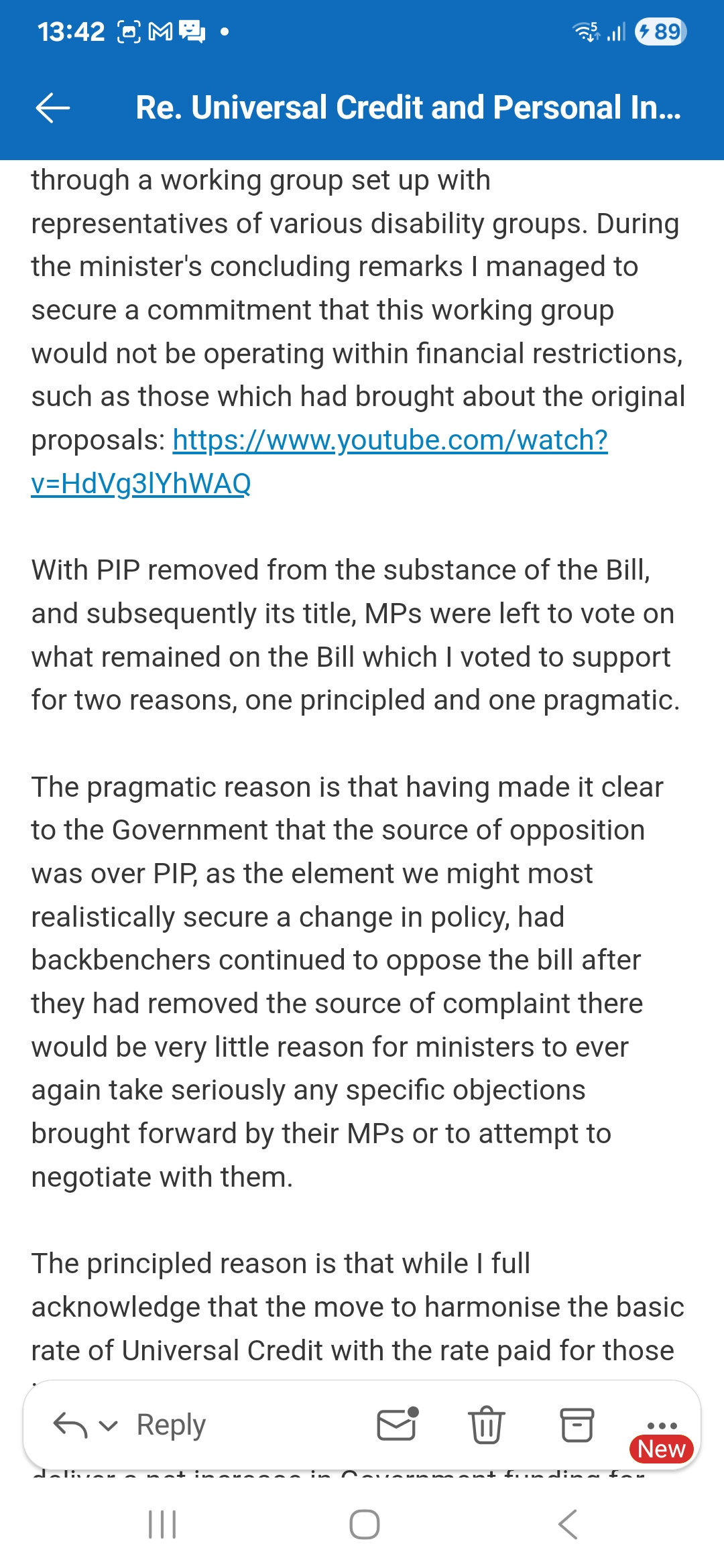 again take seriously any specific objections brought forward by their MPs or to attempt to negotiate with them.The principled reason is that while I full acknowledge that the move to harmonise the basic rate of Universal Credit with the rate paid for those in receipt of the disability element, the package of reforms which were left in the Bill as a whole deliver a net increase in Government funding for Universal Credit recipients and an overall reduction in poverty. To vote against the Bill would in effect be voting for less public money for those on low incomes and a higher rate of poverty than the alternative, something I could not reasonably do.