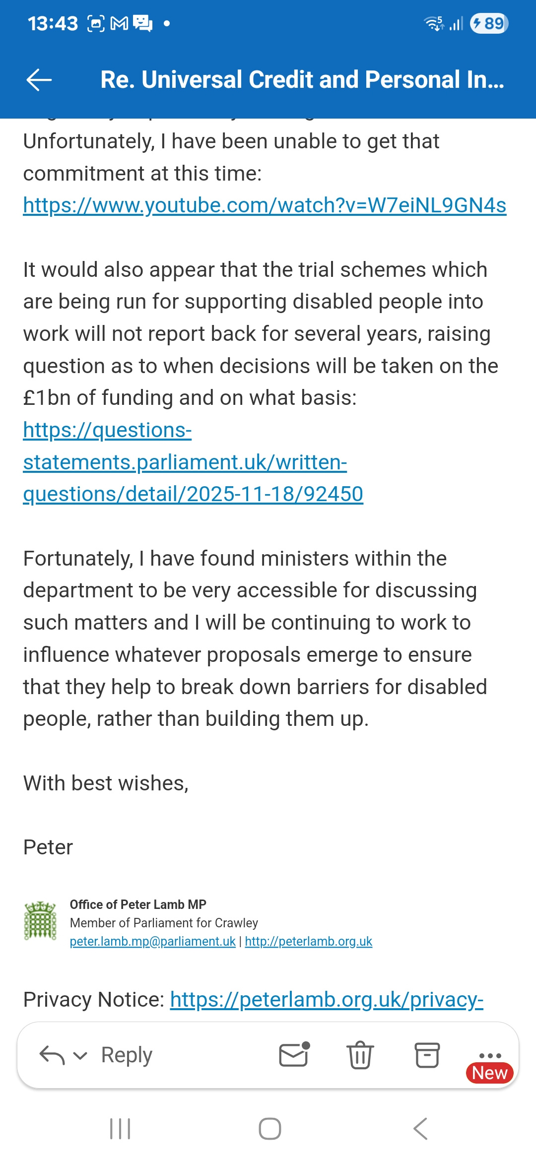 https://questions-statements.parliament.uk/written-questions/detail/2025-11-18/92450Fortunately, I have found ministers within the department to be very accessible for discussing such matters and I will be continuing to work to influence whatever proposals emerge to ensure that they help to break down barriers for disabled people, rather than building them up.