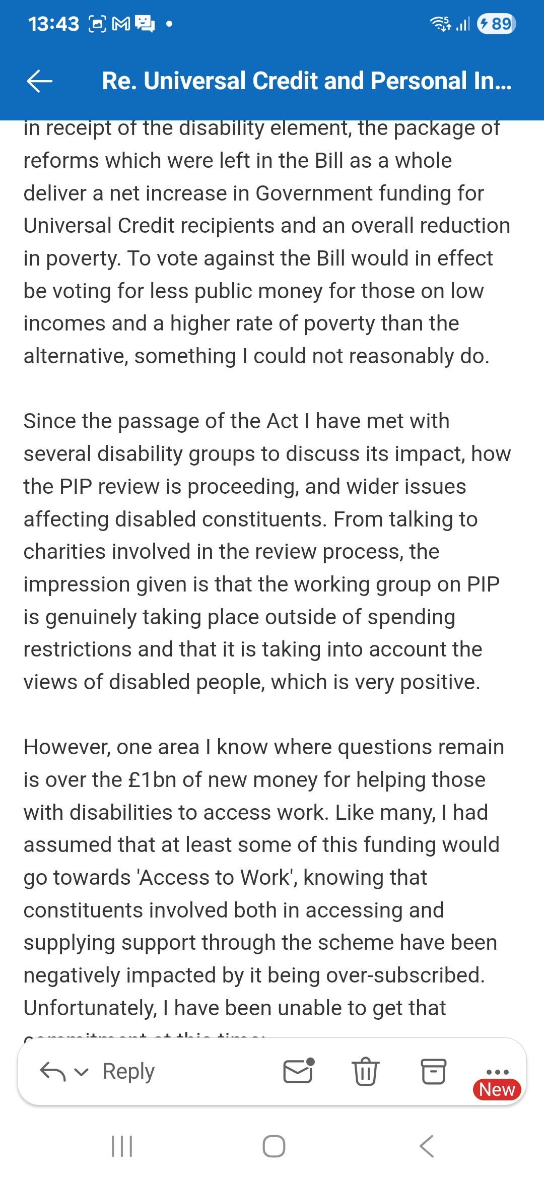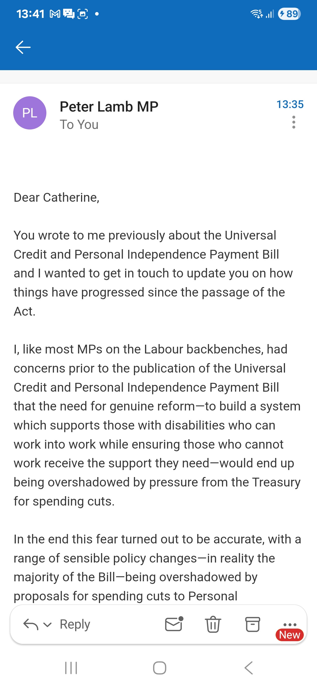 You wrote to me previously about the Universal Credit and Personal Independence Payment Bill and I wanted to get in touch to update you on how things have progressed since the passage of the Act.I, like most MPs on the Labour backbenches, had concerns prior to the publication of the Universal Credit and Personal Independence Payment Bill that the need for genuine reform-to build a system which supports those with disabilities who can work into work while ensuring those who cannot work receive the support they need-would end up being overshadowed by pressure from the Treasury for spending cuts. In the end this fear turned out to be accurate, with a range of sensible policy changes-in reality the majority of the Bill-being overshadowed by proposals for spending cuts to Personal Independence Payments.