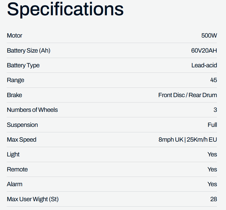 To start with - they are not lithium battery powered - they rely on an old fashioned Lead-acid battery - then there's the claimed range of 45 miles - on a 20AH battery - sorry, this is just not happening……. especially at 8mph !