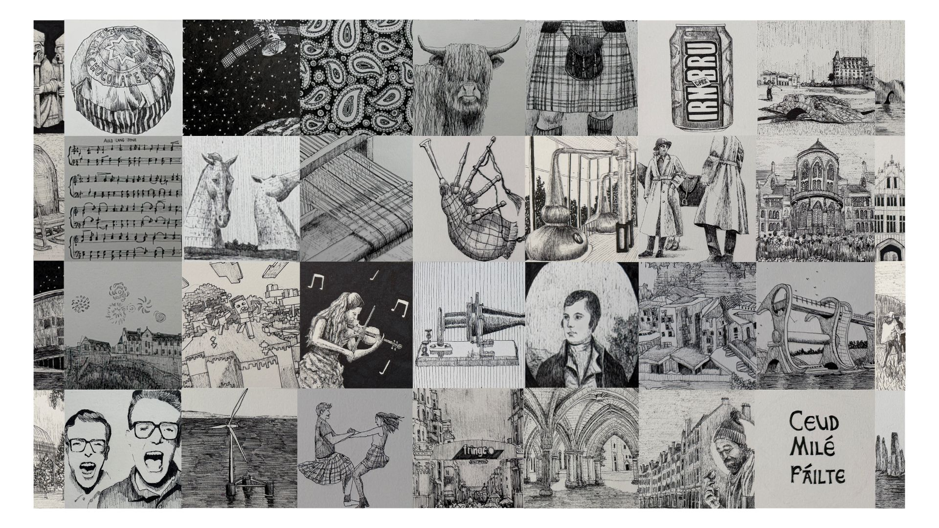 Burns Night takes place on 25th January to celebrate the life of Scotland's National Bard, Robert Burns. It involves eating haggis, neeps and tatties, and reciting Burns' famous works. Scottish artist, Louisa Schmolke has created artwork that depicts 'Scotland's creative spirit in 100 squares' which features sketches of ancient architecture, inventions, and ideas that Scotland is known for. Here's a section of it. What do you recognise?