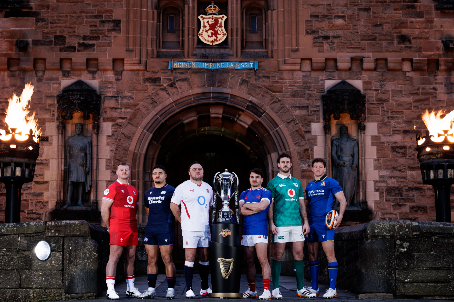 2026 Guinness Men’s Six Nations launch, Edinburgh, Scotland 26/1/2026 Pictured (L to R) is Wales’ Dewi Lake, Scotland's Sione Tuipulotu, England's Jamie George, France's Antoine Dupont, Ireland's Caelan Doris and Italy’s Michele Lamaro at Edinburgh Castle, to celebrate the start of the Championship, in the city that gave birth to international rugby