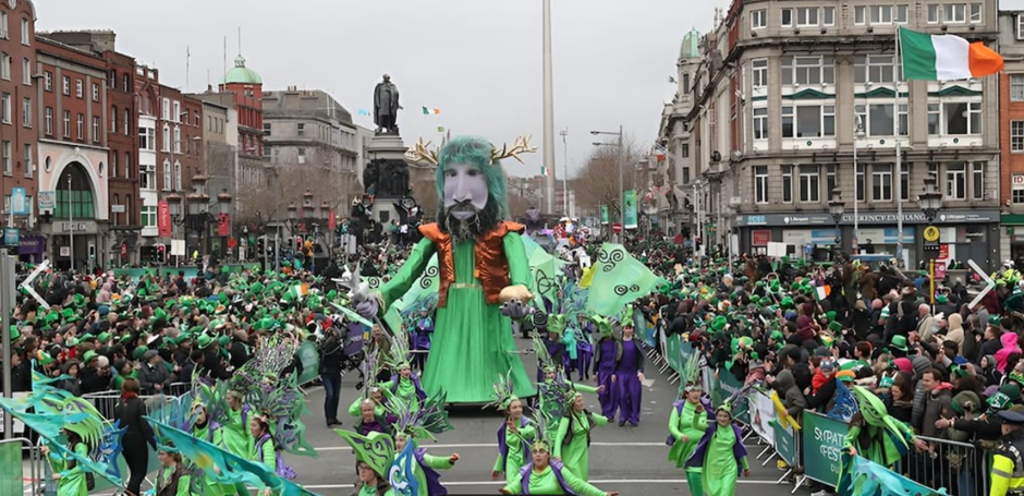 A St Patricks Day Parade with a large St Patrick and many other people dressed in green, celebrating.