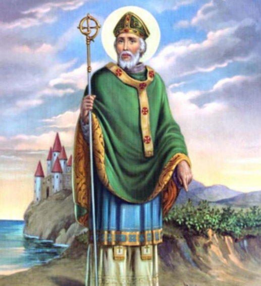 A traditional depiction of St Patrick. A bearded man dressed in a green tunic. He is standing on a beach with a castle in the background.