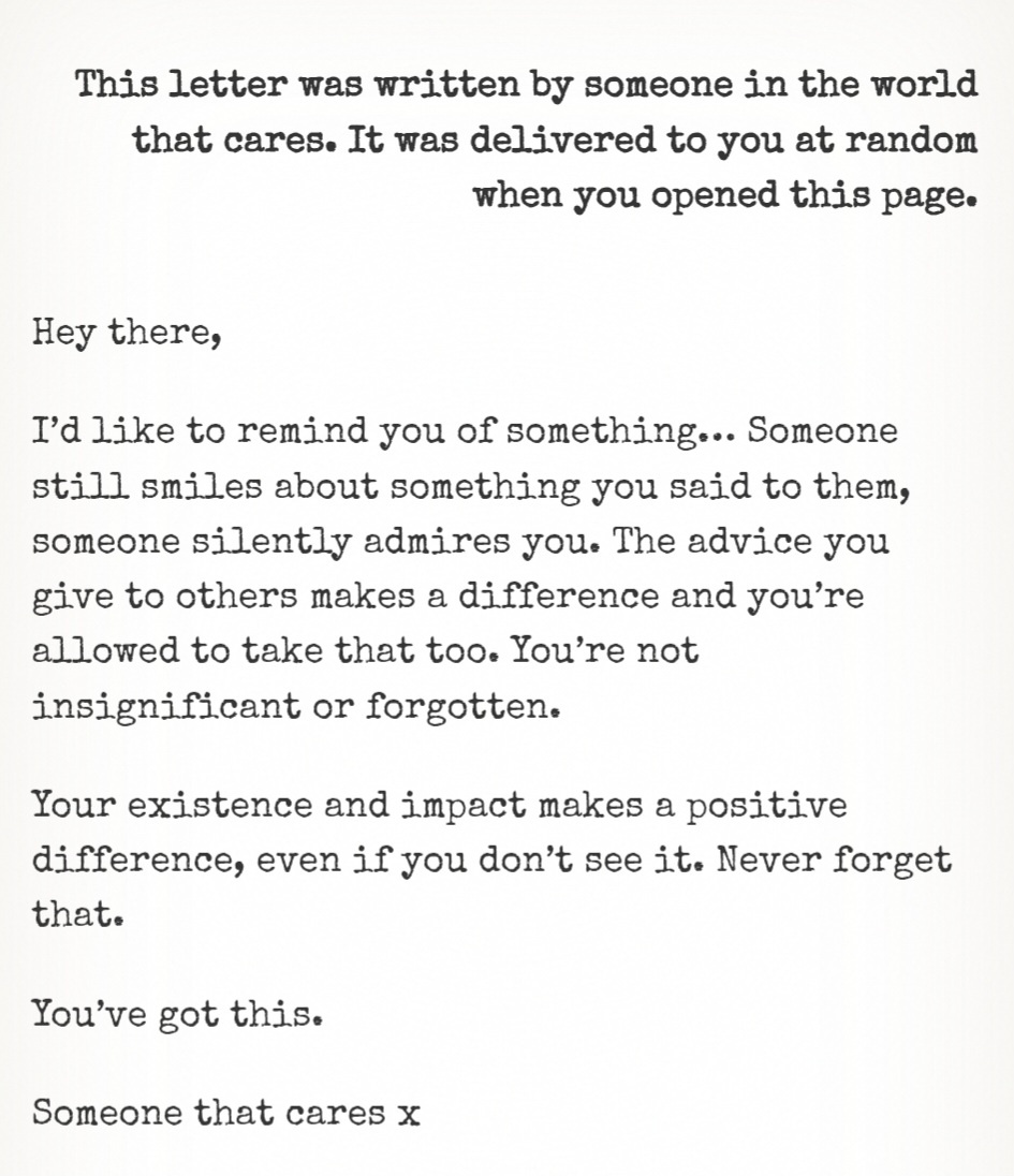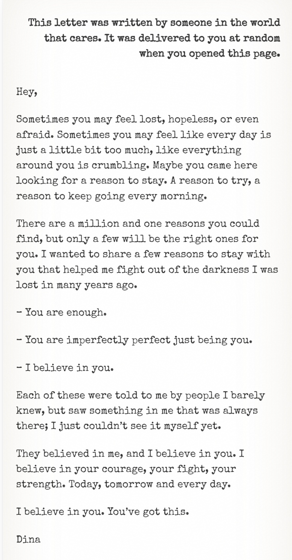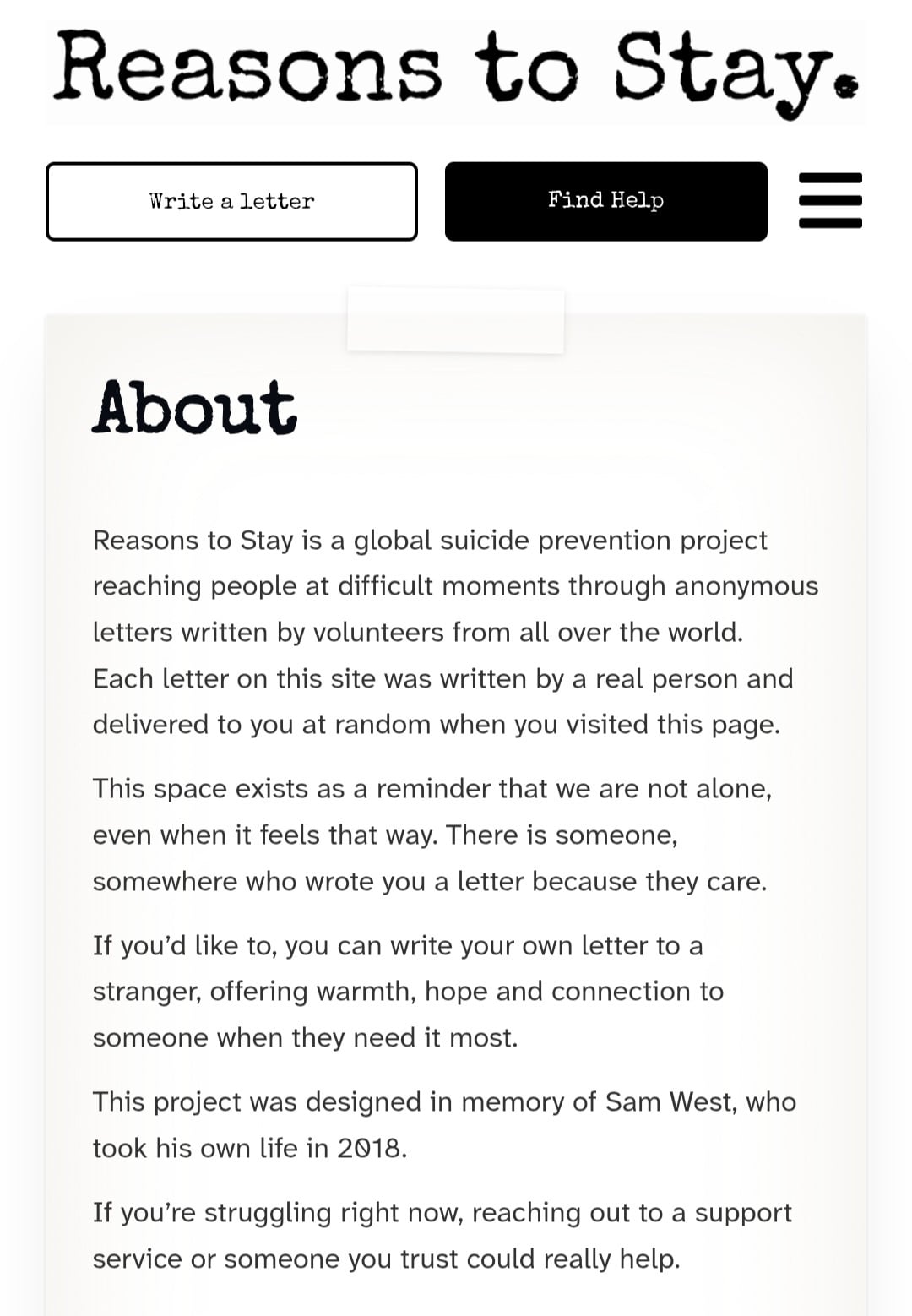 Hi. A family member just told me about this amazing international suicide prevention organisation called "Reasons to Stay" that is based on letter writing. You can read and/or write letters to encourage people to rethink committing suicide. What you read is picked at random, and what you write is sent at random. I've read a few letters. They're so compelling and so beautiful. So heartful.