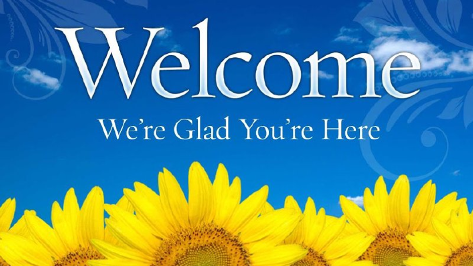 Title: Welcome. We’re glad you’re here. On a blue sky background with bright yellow sunflowers at the bottom.