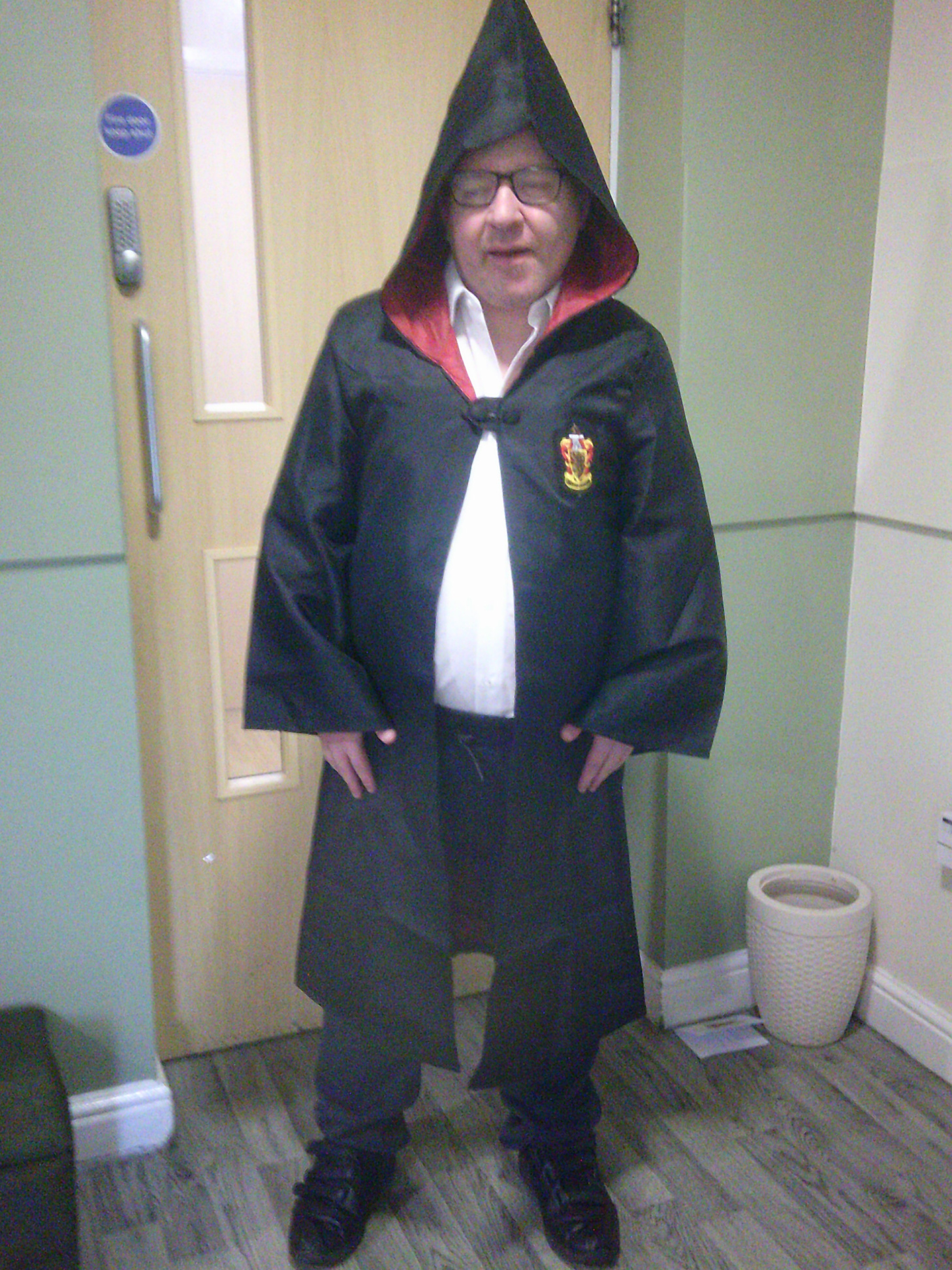 Here's me in the new Harry Potter Gryffindor Robe that arrived yesterday, complete with the white shirt I bought from ASDA this morning.